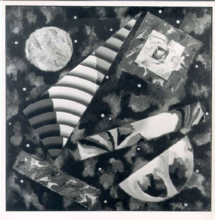 Opera pittorica che rappresenta una composizione di forme geometriche e di colore materico libero e a macchie. Le figure geometriche sono collocate in primo piano secondo direttrici diagonali. Il colore è caldo; sfumato. La stesura è uniforme; veloce. La struttura è dinamica.\nLa luce è frontale e contrastata.