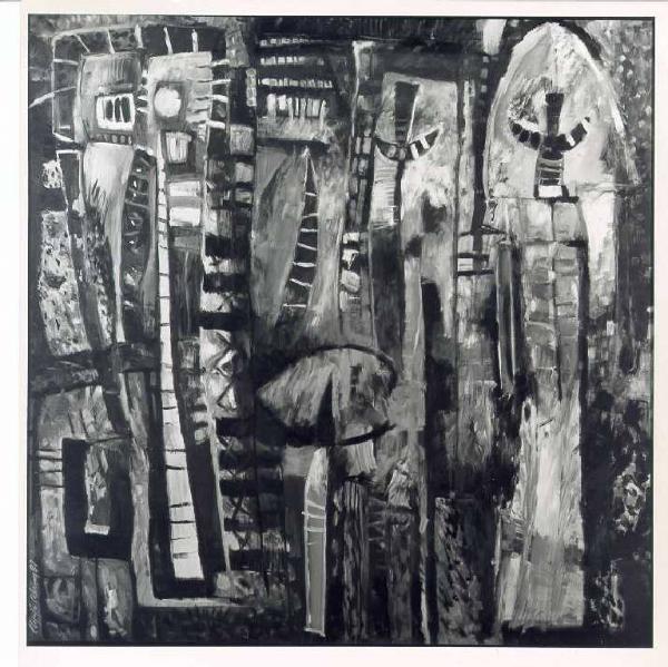 Opera pittorica caratterizzata da una composizione di forme geometriche e simboliche accostate secondo un andamento prevalentemente verticale.\nIl colore è tonale; caldo; sfumato. La stesura è spessa; nervosa. La struttura è statica. La luce è frontale; contrastata.