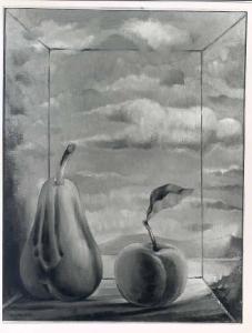 Opera pittorica che rappresenta in primo piano una pera e una mela disposte all'interno di una scatola prospettica i cui lati trasparenti lasciano vedere un ampio paesaggio di lago con montagne e una nube a forma di figura femminile. Il colore è tonale; caldo; sfumato. La stesura è uniforme; a tratto. La luce è laterale; contrastata.