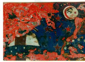 Opera pittorica cartterizzata da composizioni di frammenti di bandiere di importanti nazioni quali in alto a destra la Turchia, in alto a sinistra l'Inghilterra, in basso a destra l'URSS, con valore allegorico e secondo un andamento libero in uno spazio materico rosso e bleu. Il colore è prvalentemente caldo (rosso); sfumato. La stesura è spessa; grumosa; nervosa; a macchie. La struttura è dinamica.