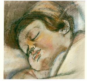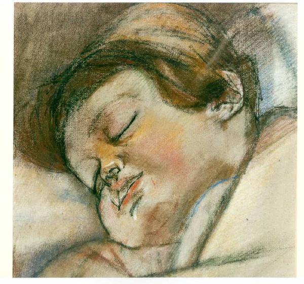 Opera pittorica che rappresenta una testa di un bambino dormiente appoggiata ad un cuscino. Il colore è tonale; caldo (terre); sfumato. La stesura è sottile; nervosa. La luce è laterale; contrastata.