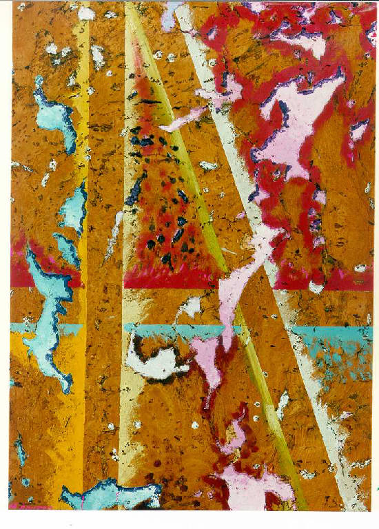Opera pittorica costituita da una composizione di segni e forme disposti liberamente al di sopra di una composizione geometrica ottenuta con rette diagonali, orizzontali e verticali. Il colore è caldo (bruni); freddo (azzurro). Il supporto è sughero. La stesura è grumosa; nervosa; veloce, con incisioni e intagli nel sughero. La struttura è dinamica. La luce è contrastata.