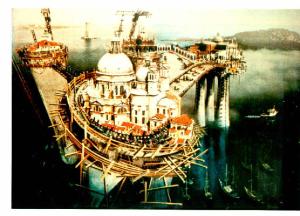 Opera fotografica che rappresenta una Venezia fantastica e solo parzialmente riconoscibile. In primo piano l'isola di San Giorgio con la Chiesa della Salute, circondata da ponteggi lignei, è collegata ad altre importanti chiese veneziane attraverso il ponte dell'Accademia, il ponte di Rialto e un altro ponte. Intorno si estende la laguna venea plumbea e inquinata. Il colore è tonale; freddo (grigio);sfumato. La luce è frontale; contrastata.