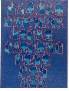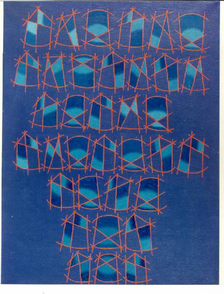 Opera pittorica caratterizzata da una composizione di forme geometriche linerari disposte una acconto all'altra in fila orizzontali su un fondo uniformemente bleu. Il colore è freddo (bleu); piatto. La stesura è piatta; uniforme. La struttura è ritmica. La luce è diffusa.