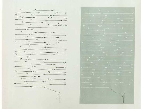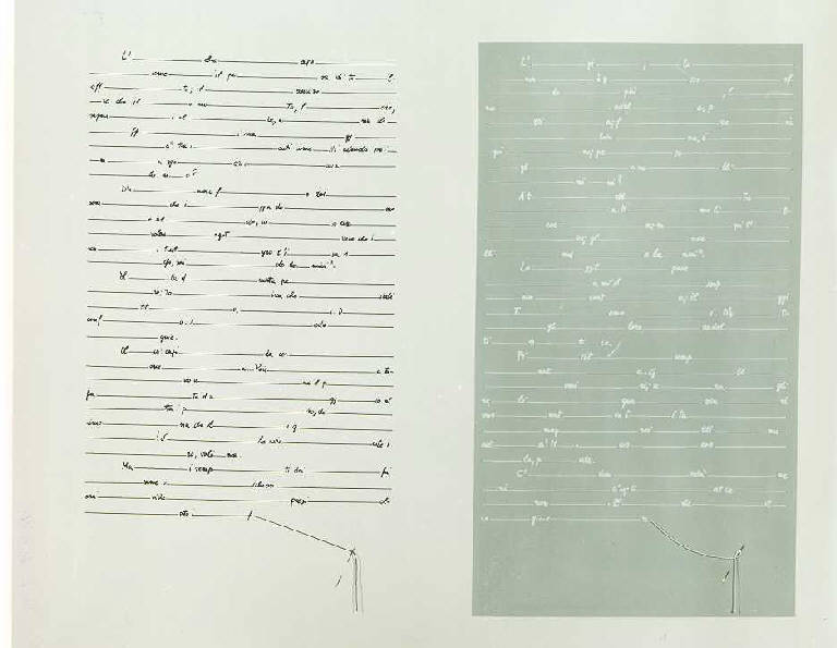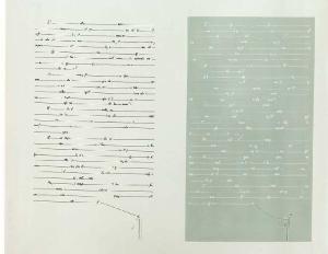 Opera in stoffa in cui lo spazio compositivo è diviso in due parti come due pagine di un quaderno. A sinistra si dispongono orizzontalmente lettere e linee cucite con filo nero su fondo bianco; a destra lettere e linee sono cucite con filo bianco su fondo grigio. La scrittura a corsivo segue un andamneto orizzontale.