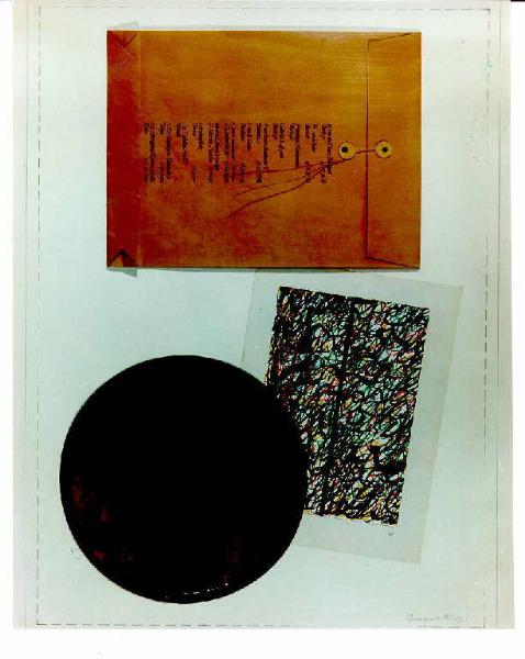 Lo spazio compositivo bianco è occupato in alto da una busta chiusa rettangolare, al centro da una pagina a stampa che riproduce un dipinto informale (Pollock?), in basso a sinistra da un coperchio di una crema per calzature. Segno: scrittura (orizzontale, corsivo, a stampa).