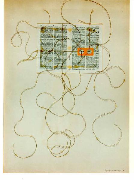 Due pagine aperte di un dizionario sono disposte in alto e al centro del campo compositivo. Sulla pagina di destra è incollato un rettangolo arancione con due fori simmetrici. Il libro è legato con un lungo spago che si estende in direzioni diverse e curvilinee nel rimanente spazio.\nSegno: linea (continua, a rilievo, cruva ondulata); scrittura (orizzontale, corsivo, stampatello, a stampa, periodo).