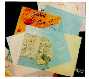 In primo piano al centro è collocato un foglio strappato scritto con una grafia minuta. A partire dal secondo piano si susseguono una serie di rettangoli dal cromatismo alternativamente piatto e sfumato che coprono l'intero spazio a disposizione.\nColore: tonale; caldo (arancione); freddo (azzurro); sfumato; piatto.\nStesura: veloce; a rilievo; collage.\nSegno: linea (curva ondulata, modulata, sottile, grossa); scrittura (orizzontale, corsivo, frase, manuale).