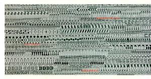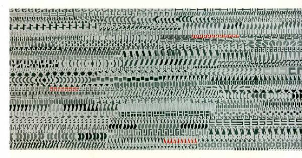 Composizione di lettere disposte con regolarità secondo un andamento orizzontale e ritmico, modulato dalle variazioni di intendità luminosa.\nColore: cromatico; freddo (grigio, nero); piatto. Stesura: uniforme.\nSegno: scrittura (orizzontale, corsivo, stampatello, manuale, lettera).\nStesura: a texture. Luce: contrastata.