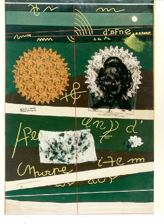 Composizione a collage di stoffe, pizzi, fotografie uniti a interventi pittorici e a segni-scrittura disposti in fasce diagonali e a fondo scuro.\nColore: cromatico; caldo (verde); piatto.\nMateria: pizzo: fotografia; stoffa; acrilico.\nSegno: linea (sottile, continua, curva ondulata); scrittura (diagonale, corsivo, stampatello, manuale, a stampa, lettera, frase).