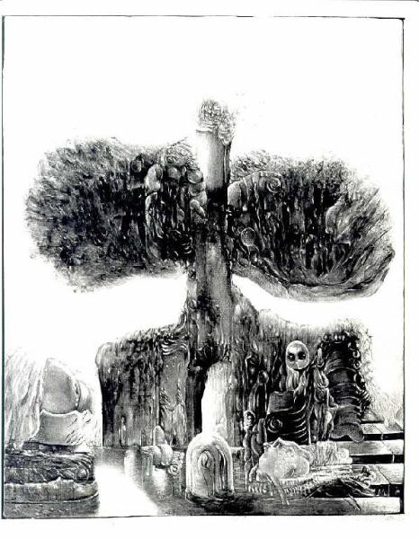 In primo piano forme misteriore in metamorfosi galleggiano su una superficie paludosa. In secondo piano dall'acqua emerge una grande montagna a forma di fungo atomico sulle cui pareti e al cui interno vibrano altre forme in metamorfosi. Il paesaggio sembra l'archetipo dell'inizio o della fine del mondo. Colore: tonale; caldo; sfumato. Stesura: veloce; grumosa.