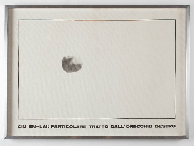 All'interno di un vasto campo compositivo bianco delimitato da una sottile cornice nera, è collocato un ingrandimento fotografico che l'artista, con una scritta in stampatello, ci indica essere il "particolare dell'orecchio destro di Ciu En Lai".