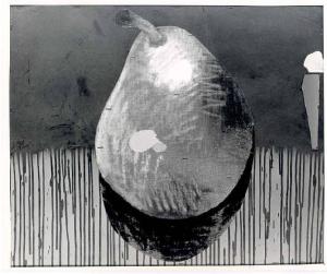In primo piano una grande pera chiaroscurata occupa in altezza quasi tutto lo spazio a disposizione. Il piano di fondo è diviso in due fasce orizzontali, uniforme quella superiore e sgocciolata quella inferiore. Stesura: veloce; sgocciolata. Luce: frontale.