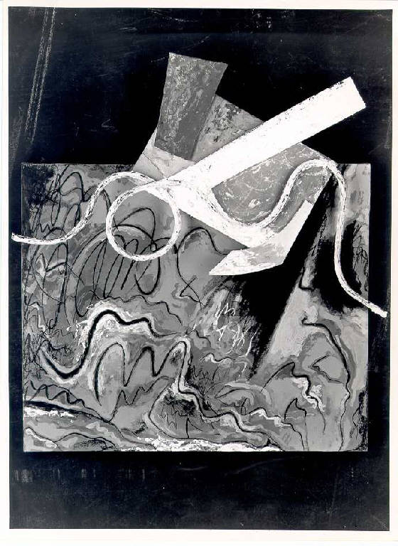 Composizione di segni ondulati e di forme libere in uno spazio azzurro senza profondità. In alto segni e forme assumono consistenza tridimensionale staccandosi dal piano e uscendo dai limiti del quadro.\nColore: tonale; cromatico; caldo (arancione, giallo); freddo (azzurro, viola).\nStesura: veloce; nervosa; a rilievo. Struttura: dinamica. Luce: contrastata.