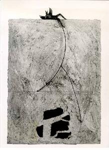 Lo spazio compositivo è trattato con una materia libera e informale su cui risaltano in basso forme chiuse, irregolari e scure contenute in un recipiente triangolare da cui parte una linea in ferro che si distacca dalla superficie del dipinto e conduce ad un piccolo diavoletto tridimensionale sdraiato sulla cornice superiore del dipinto. Colore: tonale; caldo (terre); sfumato.\nStesura: veloce; spessa; a rilievo. Struttura: statica. Luce: frontale.