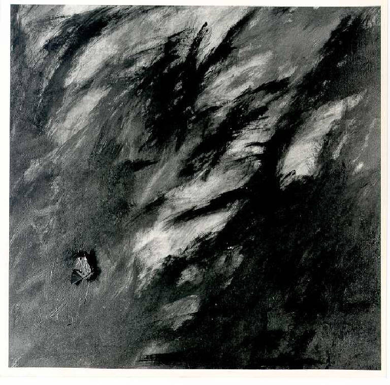 Composizione di segni liberi e informali dati con velocità secondo una direttrice diagonale da sinistra a destra. In basso a sinistra la tela si apre con una linguetta di ferro e pare uscire la materia generatrice del dipinto.\nStesura: nervosa; veloce; a rilievo. Struttura: dinamica.\nLuce: controllata, laterale.