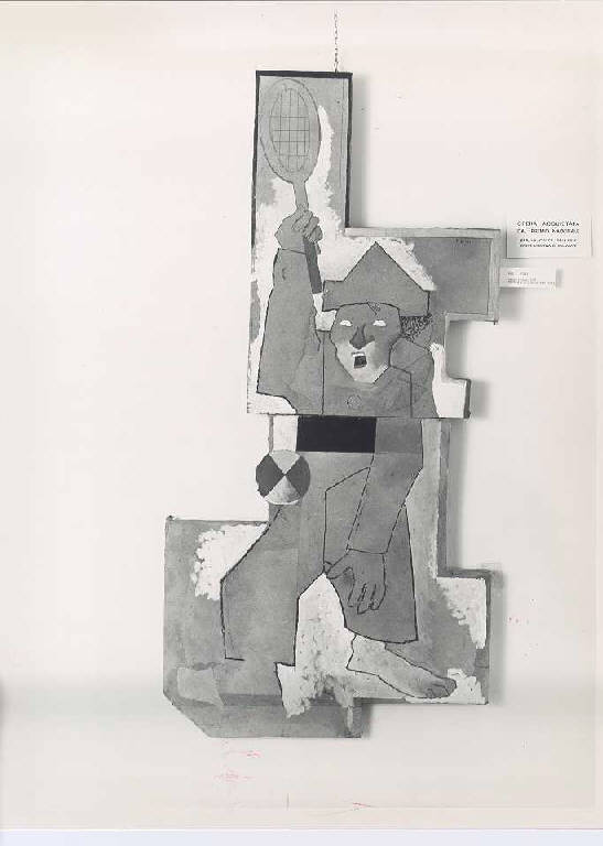 Opera pittorica che rappresenta un clown visto frontalmente con il braccio destro alzato e in mano una racchetta da tennis, pronto a colpire una pallina sospesa all'altezza della vita. Lo spazio compositivo è sagomato.\nPersonaggio: Clown. Colore: cromatico; caldo; piatto.