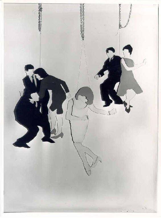 Opera sagomata a forma di sei personaggi rappresentati in atto di ballare il twist realizzati in perspek, sono divisi in tre gruppi rispettivamente di tre, due e un ballerino. I tre gruppi sono appendibili a parete in posizioni diverse. Colore: cromatico; freddo; piatto.