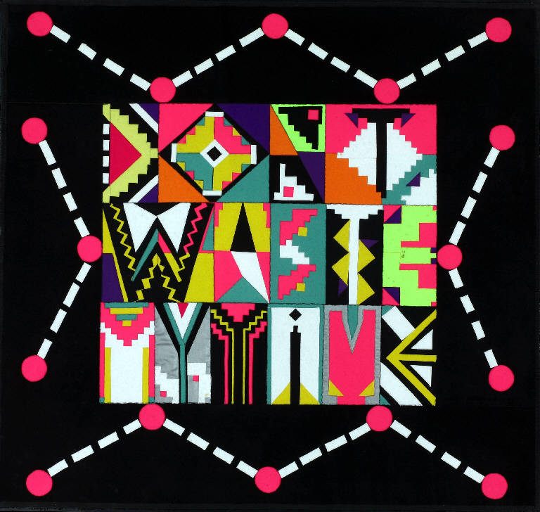 Opera pittorica che rappresenta una composizione di figure geometriche irregolari e a colore piatto disposte all'interno di un quadrato collocato al centro dello spazio e diviso internamente in rettangoli. Esternamente al quadrato si aprono segmenti di linee e punti. Colore: cromatico; caldo (rosso, giallo); piatto. Stesura: uniforme. Linea di contorno grossa, nitida.\nStruttura: dinamica.