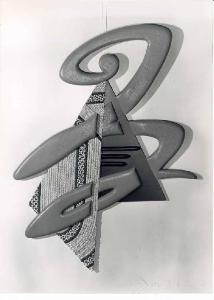 Opera polimaterica costituita da forme geometriche libere, dinamiche intersecate secondo uno schema verticale con al centro due triangoli.\nIl colore è freddo.ateria: legno; fibre vegentali; nitro. La stesura è piatta; uniforme; grumosa e la struttura è dinamica.