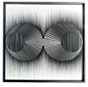 Opera cinetica in cui al centro dello spazio compositivo sono collocati due cerchi simmetrici che si toccano e al cui interno vi sono altri du cerchi. La composizione è ritmata attraverso una serie di listelle perpendicolari al piano di fondo che creano cambiamenti di luce e di prospettiva quando lo spettatore si muove davanti all'opera.\nIl colore è freddo (verde, azzurro); piatto. La luce è variabile.
