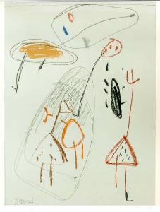 Opera costituita da una composizione di forme e segni semplici e quasi infantili, triangoli, cerchi, ellissi, ottenute con un segno-scrittura su fondo bianco. Il colore è caldo (giallo, arancione); sfumato. La stesura è veloce; sottile.