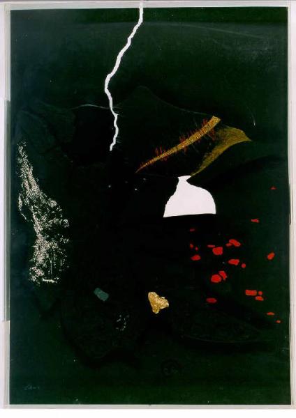 Opera pittorica in cui lo spazio compositivo uniformemente nero è composto attraverso la sovrapposizione di piani sagomati neri che conferiscono l'idea di un paesaggio immaginario digradante in profondità. I diversi piani sono inoltre caratterizzati attraverso interventi pittorici bianchi o rossi o dorati. Il colore è freddo (nero); piatto. La stesura è uniforme; a rilievo. La stesura è veloce, frammentata a macchia. La luce è contrastata.