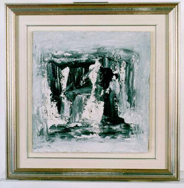 Opera pittorica costituita da una composizione di forme cromatiche libere e informali disposte secondo una struttura quadrangolare posta al centro dello spazio e circondata da margini grigi. Il colore è tonale; freddo (grigio); sfumato. La stesura è stratificata; a macchia; a tassello. La luce è contrastata.