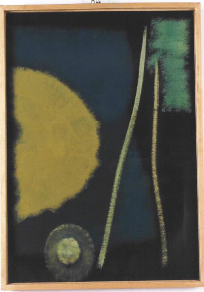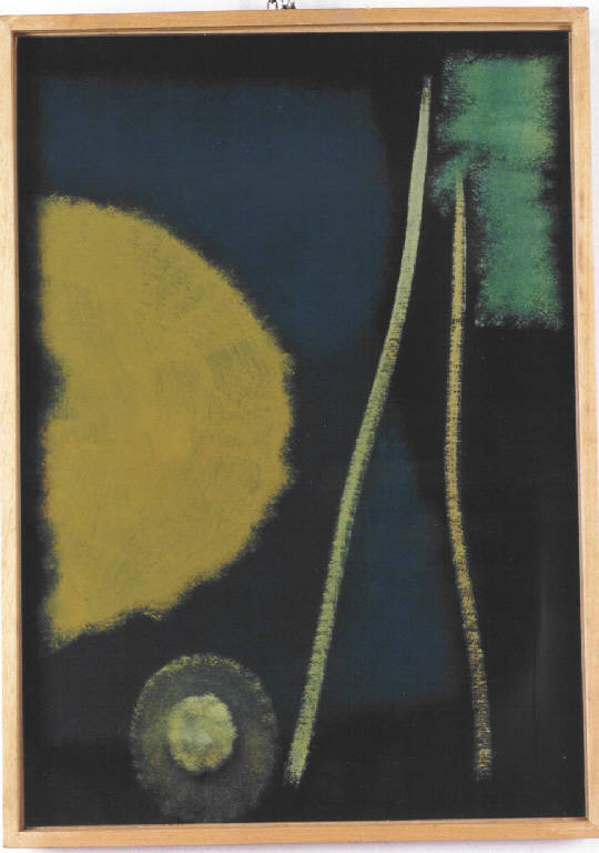 Opera pittorica costituita da una composizione di forme libere in uno spazio verde e nero. A sinista il campo è quasi completamente occupato da una mezza luna gialla. In basso fa da contrappeso un sole giallo. A destra chiudono la composizione due rette gialle diagonali.\nIl colore è tonale; caldo (giallo); freddo (verde; nero); sfumato. La stesura è libera; veloce; a macchia; a tratto. La luce è contrastata.