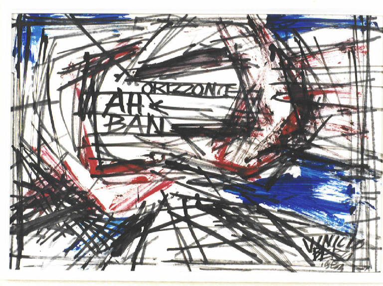 Opera costituita da una composizione di segni neri, rossi, bleu su fondo bianco disposti secondo un andamento diagonale e a vortice. Al centro il titolo dell'opera scrtitto in stampatello. Il colore è freddo (nero, azzurro); caldo (rosso); sfumato. La stesura è veloce, nervosa. La luce è frontale e contrastata.