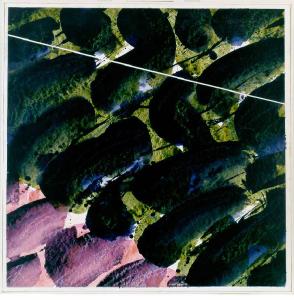 Opera costituita da una composizione di forme curvilinee chiare e scure disposte e sovrapposte secondo un andamento diagonale. In alto una retta bianca obliqua taglia in due lo spazio. Il colore è tonale; freddo (grigio, viola). La stesura è uniforme; trasparente; a macchia.