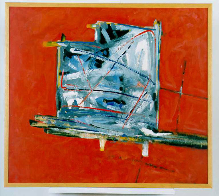 Opera costituita da una composizione di segni violenti e veloci, prevalentemente grigi, aggrovigliati e sovrapposti in una struttura quadrangolare disposta al centro di uno spazio modulato rosso.\nll colore è caldo (rosso); freddo (grigio, azzurro); sfumato. La stesura è stratificata; veloce; nervosa. La luce è frontale e diffusa.