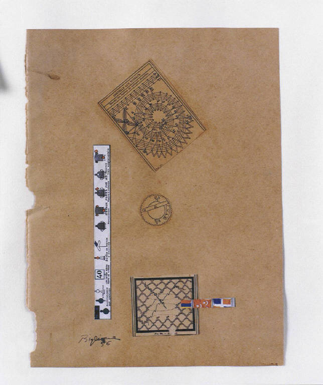 Opera costituita da timbri e elementi a collage disposti al centro dello spazio compositivo.