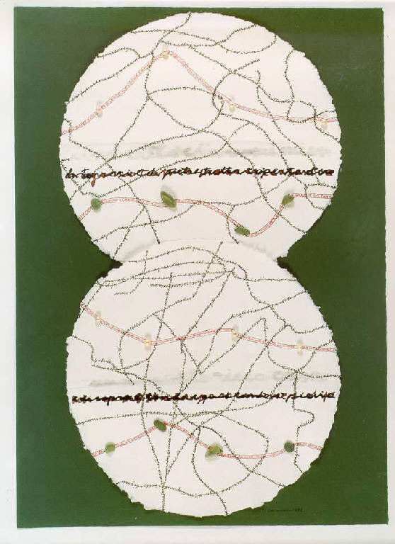 Opera polimaterica a collage in cui al centro dello spazio compositivo verde si collocano due tondi bianchi modulati al loro interno da segni-scrittura-materia. Il colore è tonale; freddo (grigio, bianco, nero); caldo (rosso). I segni-scrittura sono in corsivo. La luce è diffusa.