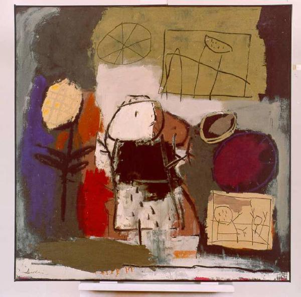 Opera pittorica che rappresenta elementi figurativi riconoscibili ottenuti con un segno semplificato infantile e senza prospettiva che si dispongono su una superficie dai colori piatti e quasi informali. Al centro si dispone un personaggio visto di profilo. Alla sua sinistra un albero, in alto un sole. Alla sua destra in basso, all'interno di un riquadro chiaro, un altro personaggio guarda un paesaggio. Il colore è tonale; cromatico; caldo (rosso, bruni, giallo); freddo (viola, azzurro); acromatico (nero, bianco, grigio).\nLa stesura è stratificata, grumosa, a pennello, a spatola, incisa.