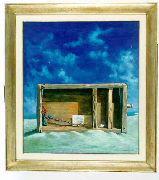 Opera pittorica che rappresenta in primo piano un cassetto di legno appoggiato orizzontalmente sulla spiaggia. In secondo piano si intravede il mare e il cielo burrascoso. Il colore è tonale; freddo (azzurro, grigio); caldo (bruni).\nLa stesura è uniforme e sottile.