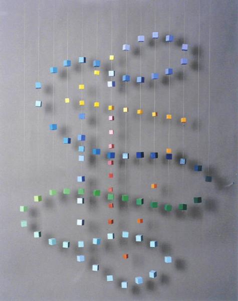 Opera cinetica costituta da una serie di piccoli cubi colorati appesi a fili di nylon a creare un motivo geometrico tridimensionale.\nIl colore è caldo (rosso, giallo, arancio, rosa); freddo (azzurro, blu, viola, verde).