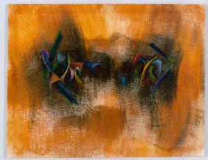 Opera pittorica costituita da una composizione di forme-colori liberi. Al centro due elementi cromatici scuri e organici si contrappongono allo spazio giallo-rosso della superficie pittorica. Il colore è tonale; caldo; (rosso, giallo); freddo (azzurro, verde); acromatico (nero).