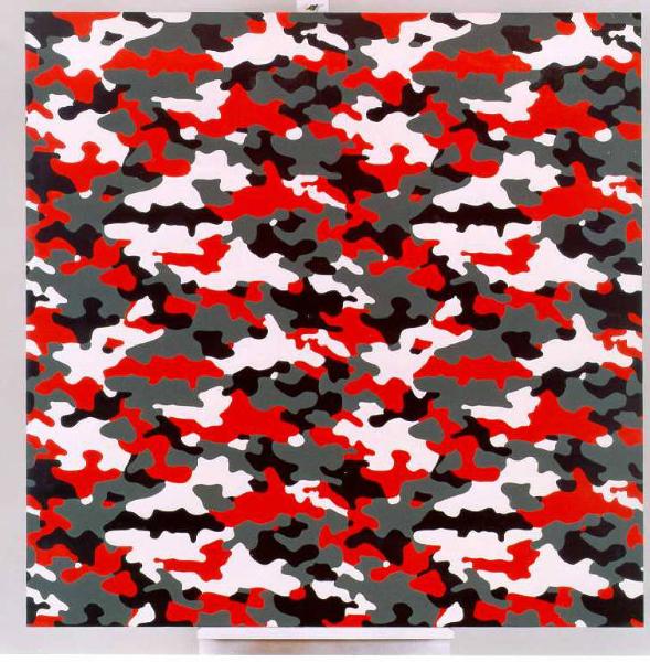 Opera pittorica costituita da piccole forme chiuse irregolari bianche, rosse, nere, grigie che si compenetrano come in un puzzle occupando l'intero spazio compositivo. Il colore è caldo (rosso); freddo (grigio); acromatico \n(bianco, nero). La stesura è sottile; uniforme. La luce è contrastata.