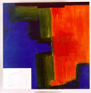 Opera pittorica in cui in basso a sinistra si apre un piccolo rettangolo bianco con al centro una forma geometrica tracciata con una linea. Il resto dello spazio compositivo è modulato da ampie zone cromatiche uniformi ma modulate che creano variazioni di luce. Il colore è caldo (rosso, arancio, giallo); freddo (verde, bleu), acromatico (bianco). La luce è laterale destra; contrastata.