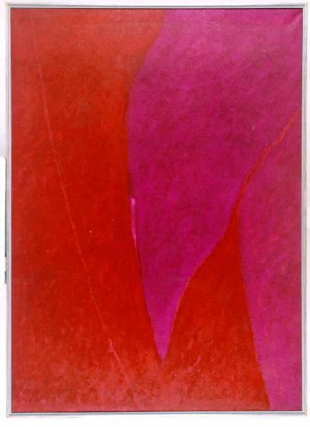 Opera pittorica costituita da una composizione di due forme libere contrapposte cromaticamente e compenetrate attraverso una struttura triangolare. Il colore è tonale; caldo (rosso); freddo (viola). La stesura è sottile; velata; frammentata. La luce è uniforme.