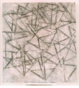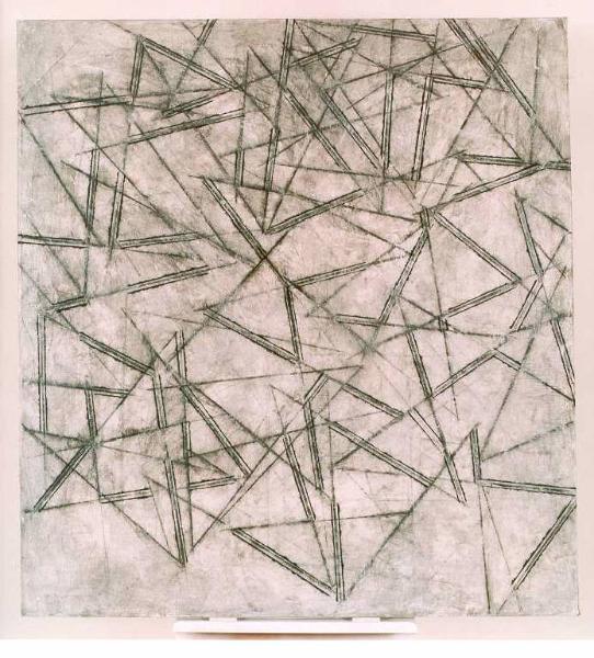 Opera costituita da una composizione libera di forme triangolari aperte di dimensione e spessore differenti, all'interno dell'intero campo compositivo.\nIl colore è tonale; freddo; acromatico (grigio). La stesura è sottile; velata; frammentaria. La luce è uniforme.