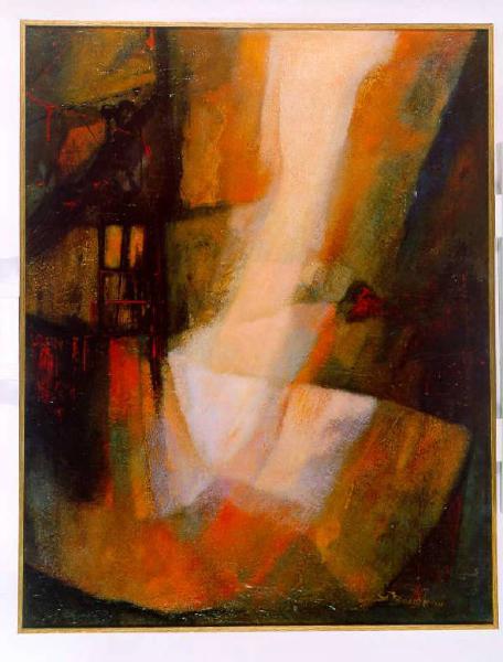 Opera pittorica costituita da una composizione di forme cromatiche libere. Al centro divide la composizione una fascia luminosa cui si contrappongono a destra e a sinistra zone di ombra profonda.\nIl colore è tonale; caldo (rosso, giallo-arancio, bruni). La stesura è stratificata. La luce è contrastata e frontale.