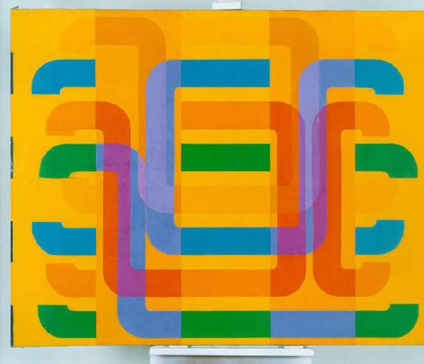 Composizione di forme geometriche a u sovrapposte secondo tre fasce verticali per creare effetti di trasparenza cromatica.\nIl colore è caldo (giallo, arancio); freddo (azzurro, verde); piatto; velato.\nLa stesura è tesa; uniforme; velata. La luce è uniforme.