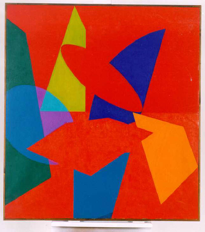Forme geometriche poligonali irregolari sono sovrapposte l'una all'altra su fondo rosso, secondo un andamento a raggiera per creare effetti di trasparenza cromatica.\nColore: cromatico; caldo (rosso, arancio); freddo (verde, azzurro); piatto; velato.\nMateria: olio.\nStesura: tesa; uniforme; velata; a pennello.\nForma: geometrica (poligonale irregolare).\nStruttura: dinamica (linee-forza oblique).\nLuce frontale.