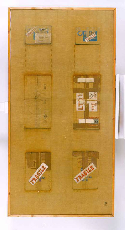 Disposti in due file verticali sono alcuni rifacimenti di buste e pacchi postali.\nColore: tonale; caldo (bruni). Stesura: sottile. Scrittura: verticale, orizzontale, obliqua, stampatello.