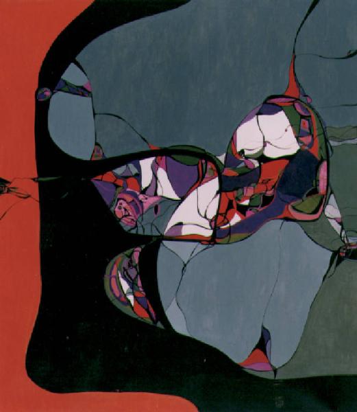 Frammenti di figure composte attraverso un accostamento di forme sinuose che riempono tutto lo spazio compositivo.\nColore: cromatico; freddo; acromatico (nero, grigio); caldo (rosso).\nStesura: velata, uniforme. Luce: contrastata.