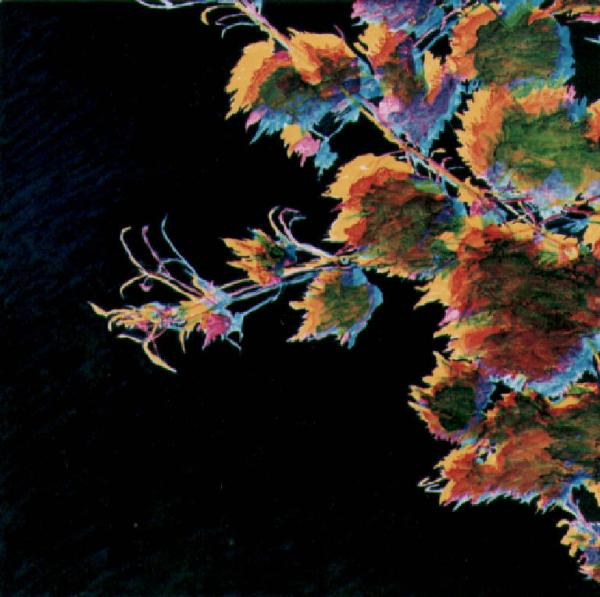 In campo nero ombre policrome viste in controluce.\nColore: cromatico; caldo (rosso, giallo); freddo (azzurro, viola).\nStesura: sottile.