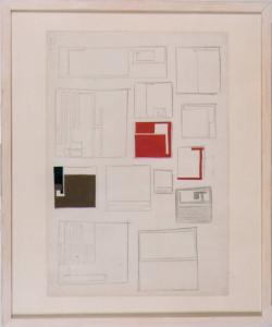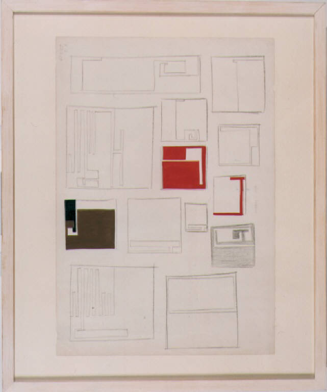 L'opera, realizzata su carta di taglio rettangolare, è composta da una serie di schizzi geometrici costituiti di base da quadrati tracciati a matita all'interno dei quali sono individuati altri elementi geometrici, che in alcuni casi generano dei veri e propri andamenti a meandro. Alcuni di questi quadrati hanno un completamento cromatico, rosso, marrone e nero, realizzato a tempera con una stesura dei colori estremamente curata, tanto che i segni appaiono sottili ed uniformi.