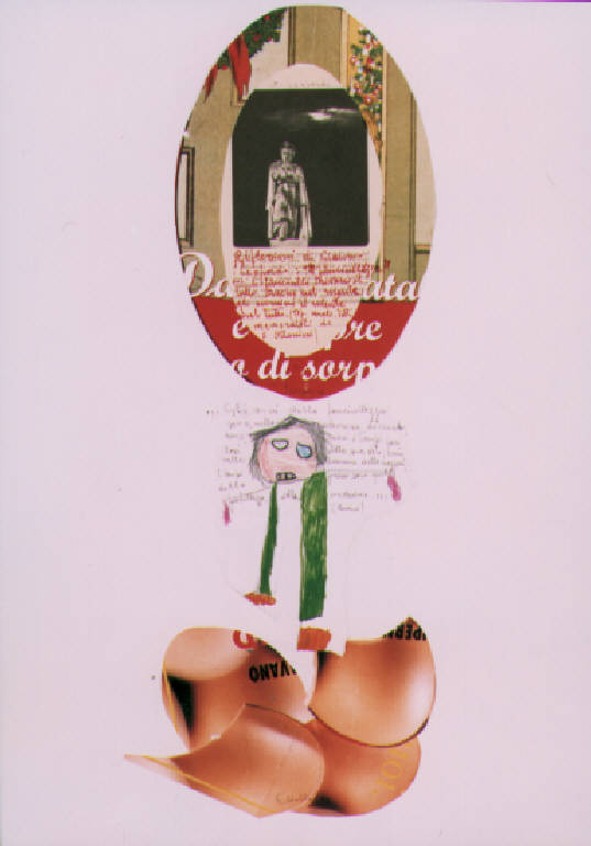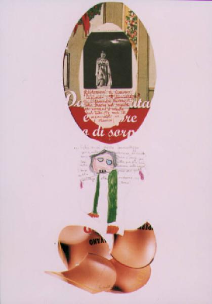 Composizione a collage di elementi figurativi che ricordano le fanciullette tratte da giornali e disegni di bambini. Segno scrittura orizzontale, corsivo, manuale e a stampa.